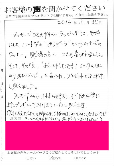 メッセージつきのかわいいラッピングに、その中にはハート型の”ありがとう”というメッセージのクッキー。職場の方へとても喜ばれました。そして、その後、「おいしかったです!ミルクのほんのりあまいかんじ」と言われ、プレゼントとしてよかったと思いました。 クッキーなので日持ちもするし、何かある度にまたプレゼントできればいいなと思います。