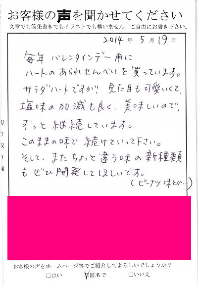 ご購入戴きました品物と一緒に写真をとって頂き、ご意見・ご感想をお寄せ頂けると幸いです 頂きましたご意見・お写真はサイト上に掲載させていただきます。ご了承下さいませ。 応募方法 ●ホームページでご応募の場合● こちらの フォームからお願いいたします。