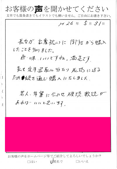 ご購入戴きました品物と一緒に写真をとって頂き、ご意見・ご感想をお寄せ頂けると幸いです 頂きましたご意見・お写真はサイト上に掲載させていただきます。ご了承下さいませ。 応募方法 ●ホームページでご応募の場合● こちらの フォームからお願いいたします。