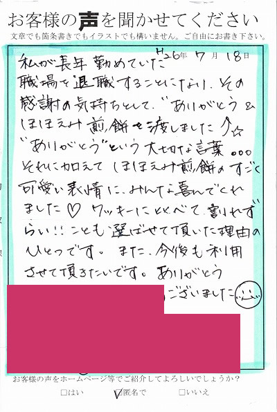 私が長年勤めていた職場を退職することになり、その感謝の気持ちとして、ありがとう&ほほえみ煎餅を渡しました。”ありがとう”という大切な言葉。。。 それに加えてほほえみ煎餅のすごくかわいい表情にみんな喜んでくれました。 クッキーに比べて割れずらい!!ことも選ばれせて頂いた理由のひとつです。また今後も利用させて頂きたいです。ありがとうございました。