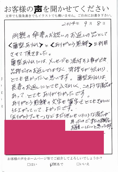 両親の傘寿のお祝のお返しの品として亀形あられとありがとう煎餅を利用させていただきました。亀形あられにはメッセージも添付することができ、品物だけのお返しではなく気持ちが伝わり、とても良かったと思います。亀形あられは、長寿のお返しにとてもふさわしく、このような商品があってとてもありがたかったです。ありがとう煎餅も文字も筆字でとてもきれいに仕上がっていて、よかったです。「ありがとうクッキー」などまだ他にもいろいろな商品があったのでまたの機会にお願いしたいと思っています。