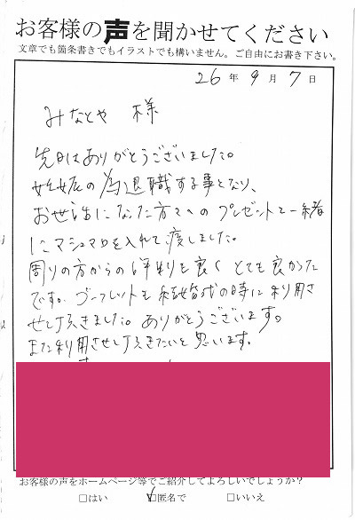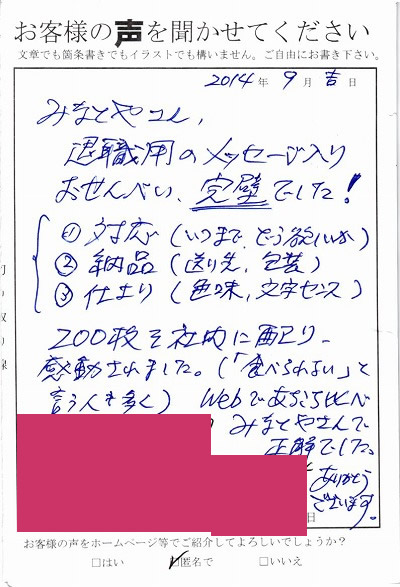 退職用のメッセージ入りおせんべい、完璧でした! @対応(いつまで、どう欲しいか) A納品(送り先、包装) B仕上り(色味、文字センス) 200枚を社内に配り、感動されました。(「食べられない」と言う人も多く) Webであちこち比べ、みなとやさんで正解でした。ありがとうございます。