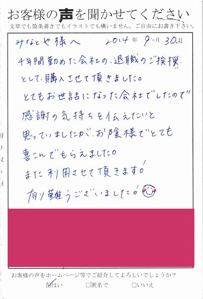 4年間勤めた会社の退職のご挨拶として購入させて頂きました。とてもお世話になった会社でしたので感謝の気持ちを伝えたいと思っていましたがお陰様でとても喜んでもらえました。また利用させて頂きます!有り難うございました!