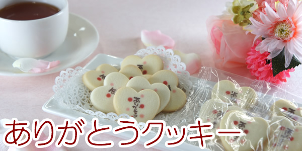 クッキーの表面に「ありがとう」のメッセージを印刷しました。白地のクッキーと赤の模様が紅白のおめでたい雰囲気をかもし出しています。