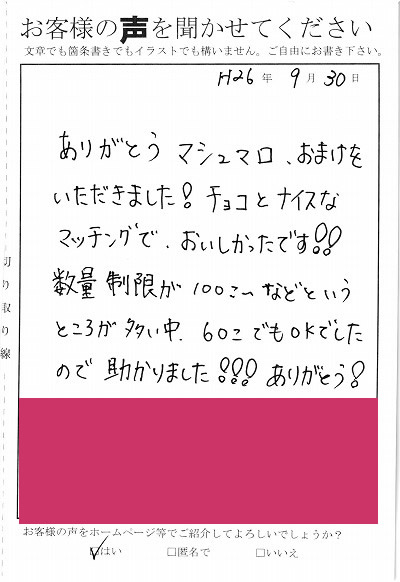 「ありがとう」の文字をチョコを包んだマシュマロにプリントしました。白地のマシュマロと赤い模様がめでたいです。子供達に人気のお菓子です。